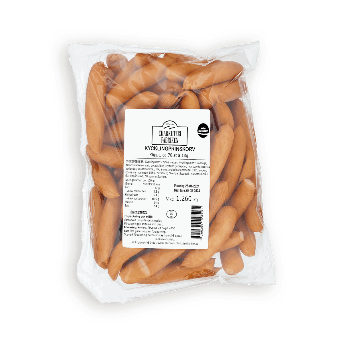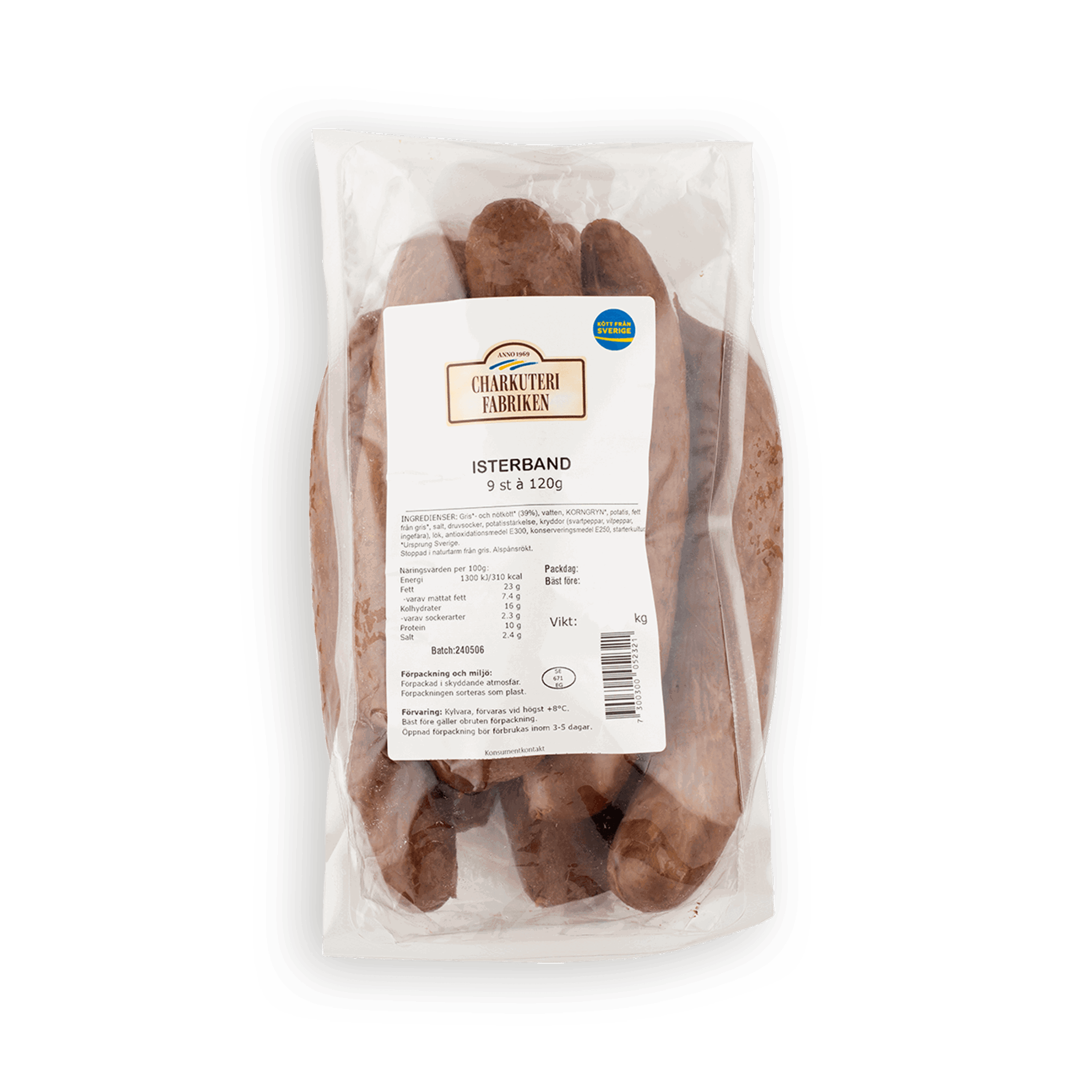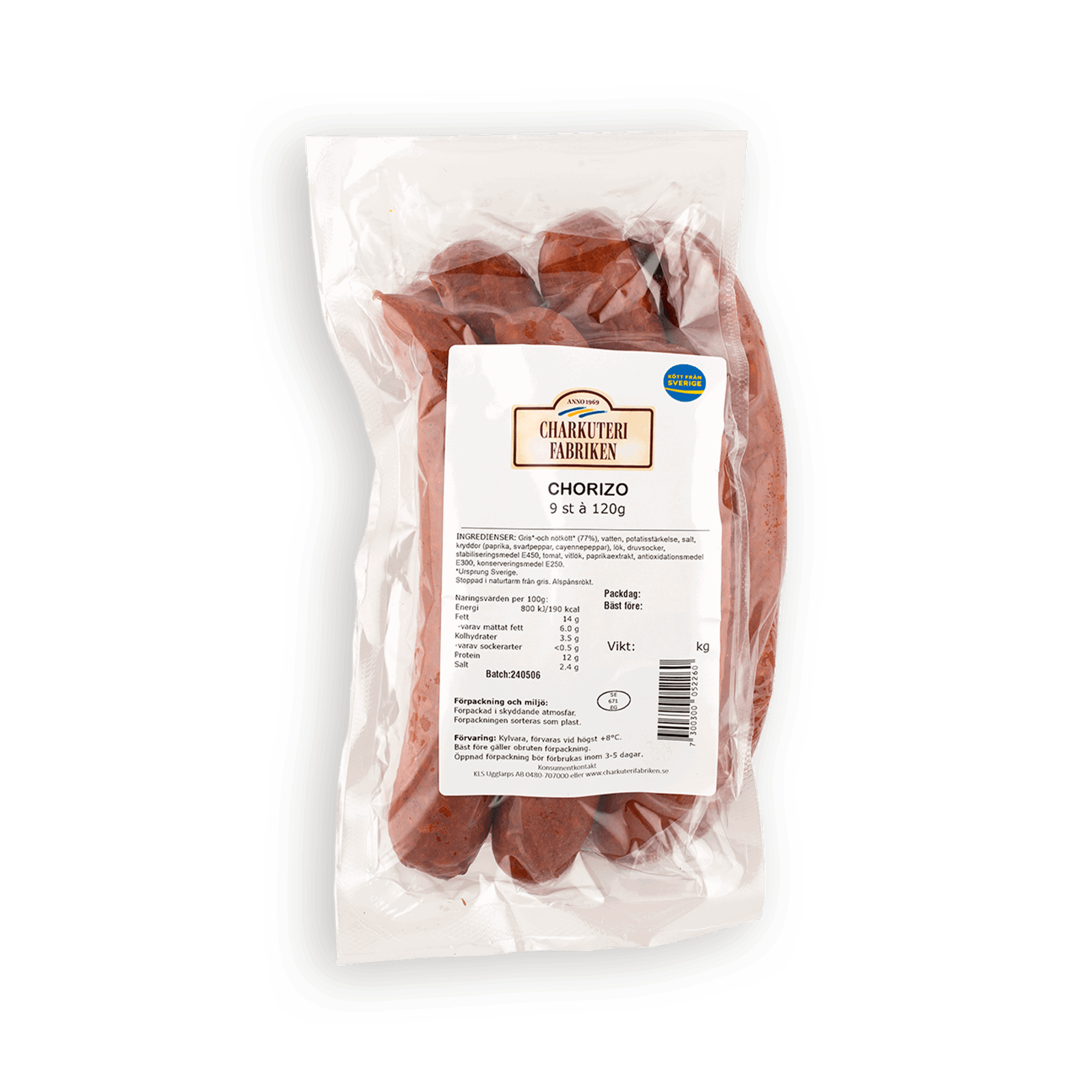 Ingredienser: Karré från gris* (66%), fett från gris*, vatten, nötkött* (6%), salt, jalapeño (grön jalapeño, vatten, ättika, salt, konsistensmedel E509), kryddor (paprika, chili, oregano, spiskummin, cayennepeppar, lagerblad, svartpeppar), honung, lök, vitlök, stabiliseringsmedel E450, konserveringsmedel E250, antioxidationsmedel E300. * = Ursprung Sverige.Stoppad i naturtarm från gris. Alspånsrökt.