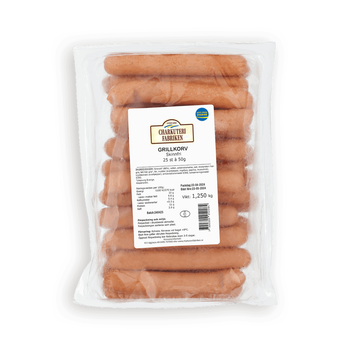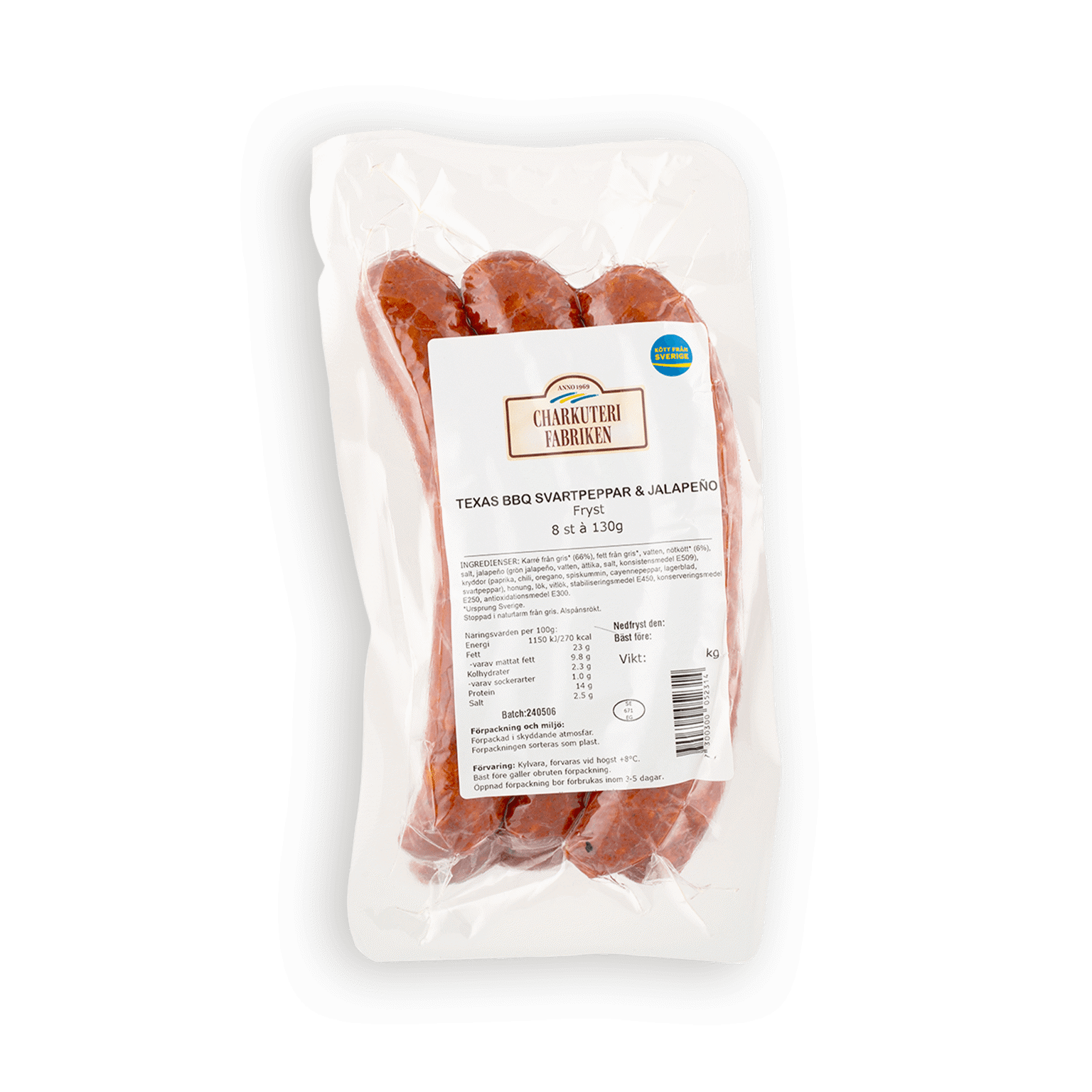 1040 gCharkuterifabrikens lyxiga extra rökta Texas BBQ korv kommer med dom stora smakerna. Hetta från bitar av jalapeno, djup sötma från honung ihop med en rejäl släng svartpeppar gör denna korven till en succé. Kryddad med paprika, anchochili, lök och vitlök kommer dina smaklökar njuta. Njut av denna korv gjord på svenskt kött av karré.