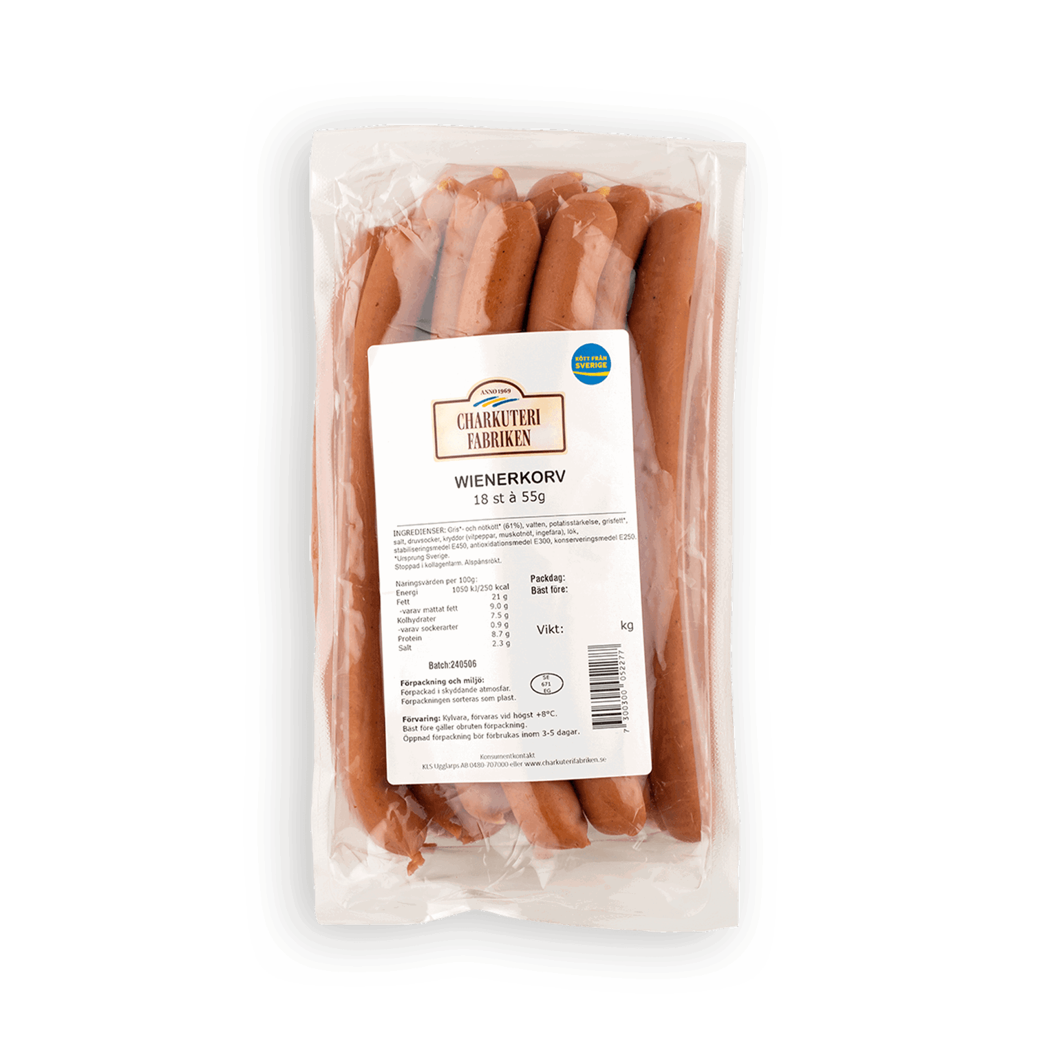1200 gNjut av högkvalitativt kött från svenska gårdar med Charkuterifabrikens wienerkorv. Saftig och smakrik, kryddad med toner av lök, muskot och ingefära. Passar alla tillfällen och alla åldrar med sin klassiska milda smaksättning och härliga rökprofil.