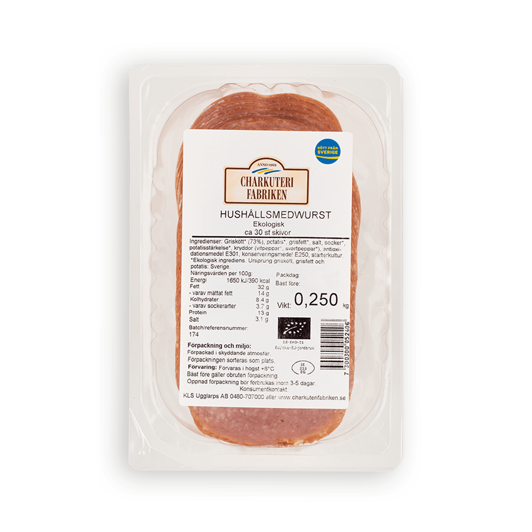 250 gCharkuterifabrikens ekologiska hushållsmedwurst är en favorit hos både unga och gamla. En välbalanserad smakprofil, med milda inslag av peppar och paprika som passar perfekt ihop med den väl avvägda syrligheten, sältan och sötman tillsammans med en underbar rökprofil. Tillverkad i Sverige, på svenskt kött från svenska gårdar.