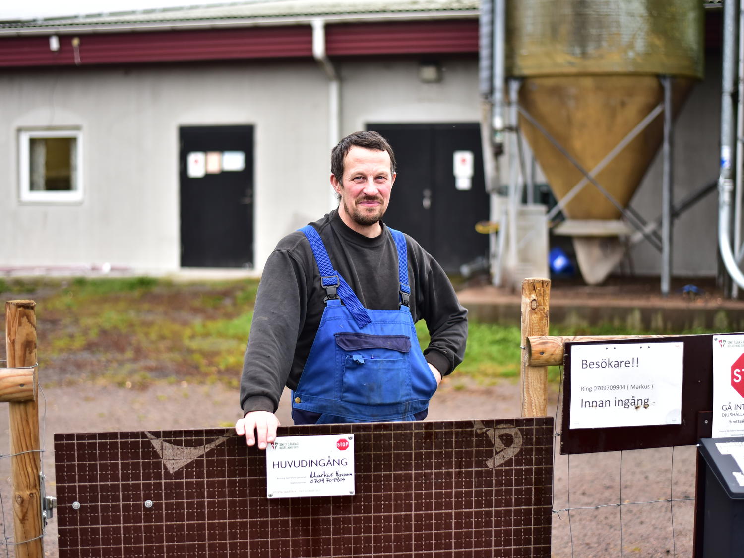 När vi kliver av bilen på gården utanför Knislinge i nordöstra Skåne, stoppas vi av en grind och ordentliga staket runt stallen. Här och var sitter det stoppskyltar och tydliga uppmaningar om att ringa Markus innan man tar sig in på gårdsplanen.
