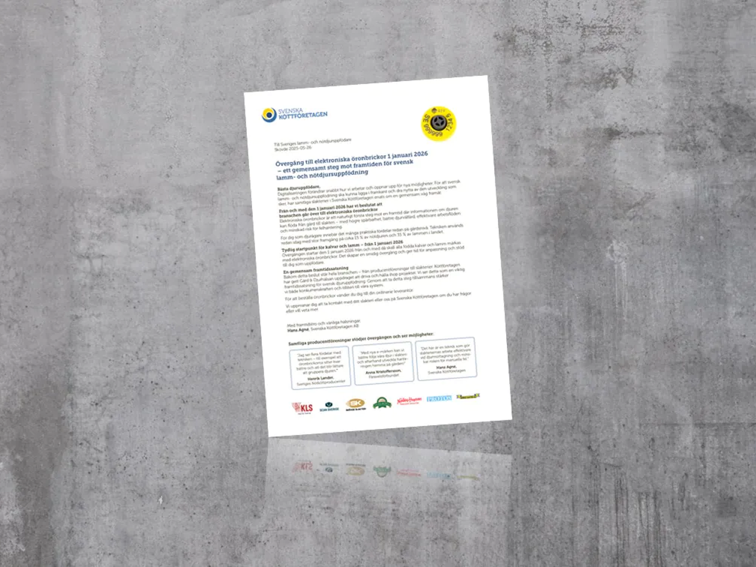 Från och med den 1 januari 2026 kommer alla nyfödda kalvar och lamm i Sverige att märkas med elektroniska öronbrickor. Det har samtliga slakterier inom Svenska Köttföretagen beslutat – ett viktigt steg mot ökad digitalisering och modernisering av svensk lamm- och nötdjursuppfödning.