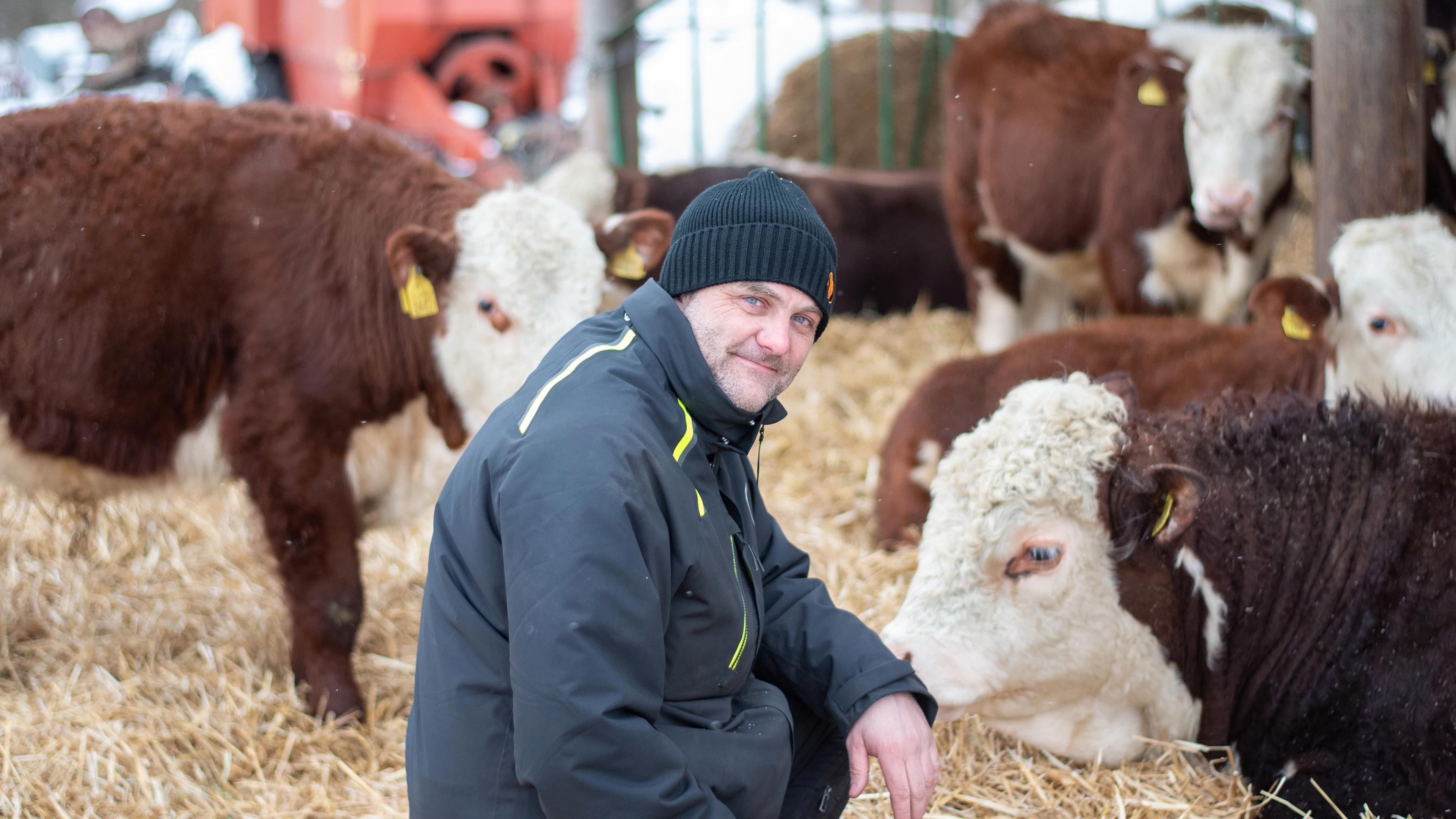 – Det hela startade med att jag och frun fick två mjölkkor i bröllopspresent på pin kiv av våra kompisar. De hade nog inte räknat med att min fru skulle bli jätteglad. Det dröjde inte många veckor innan vi köpte fler kor, men då bestämde vi oss för Hereford som är en väldigt lugn ras som passar oss. Det var 2017 och sedan dess har vi behållit alla kvigkalvar och byggt vidare på dem.