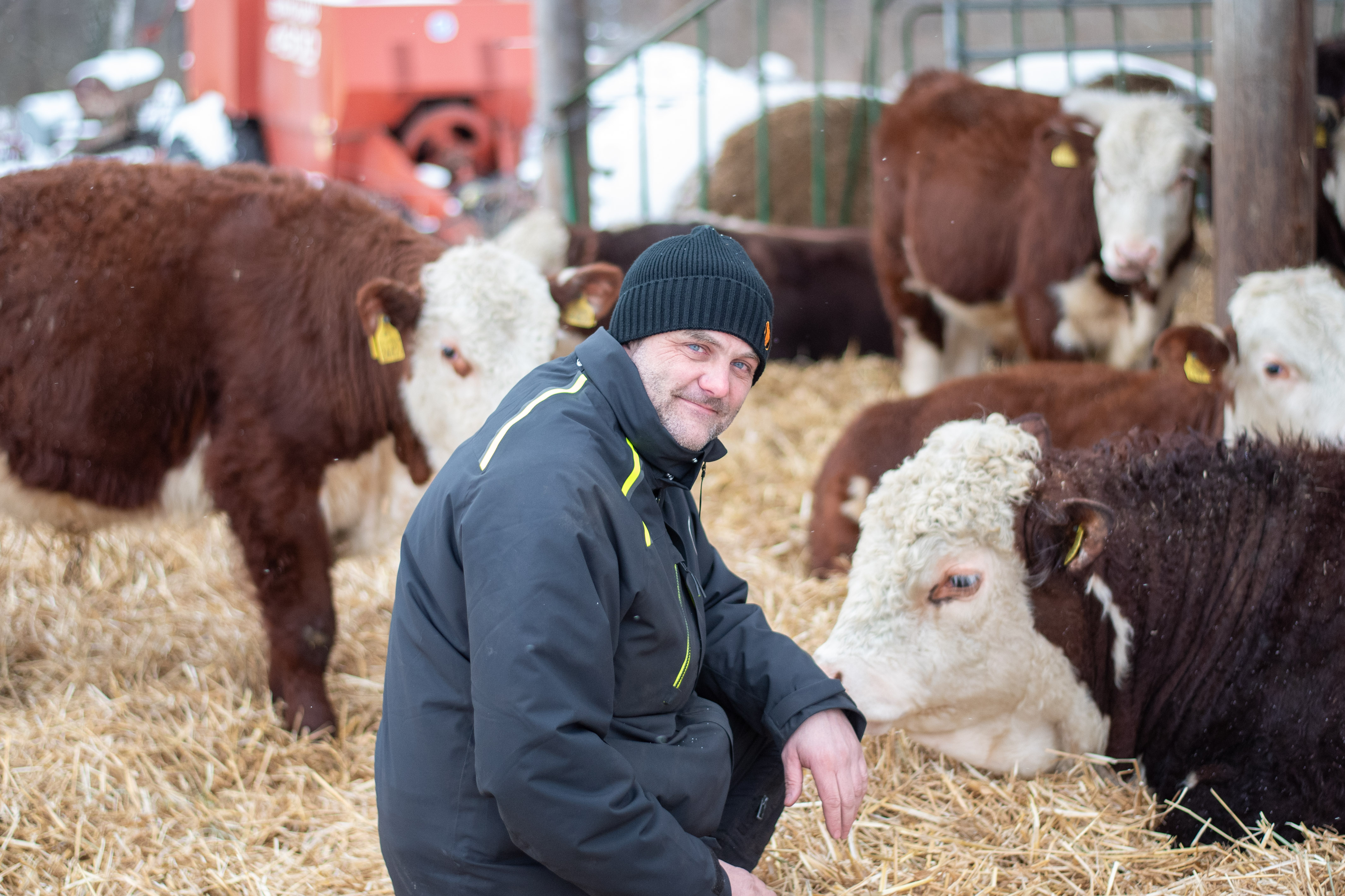 – Det hela startade med att jag och frun fick två mjölkkor i bröllopspresent på pin kiv av våra kompisar. De hade nog inte räknat med att min fru skulle bli jätteglad. Det dröjde inte många veckor innan vi köpte fler kor, men då bestämde vi oss för Hereford som är en väldigt lugn ras som passar oss. Det var 2017 och sedan dess har vi behållit alla kvigkalvar och byggt vidare på dem.