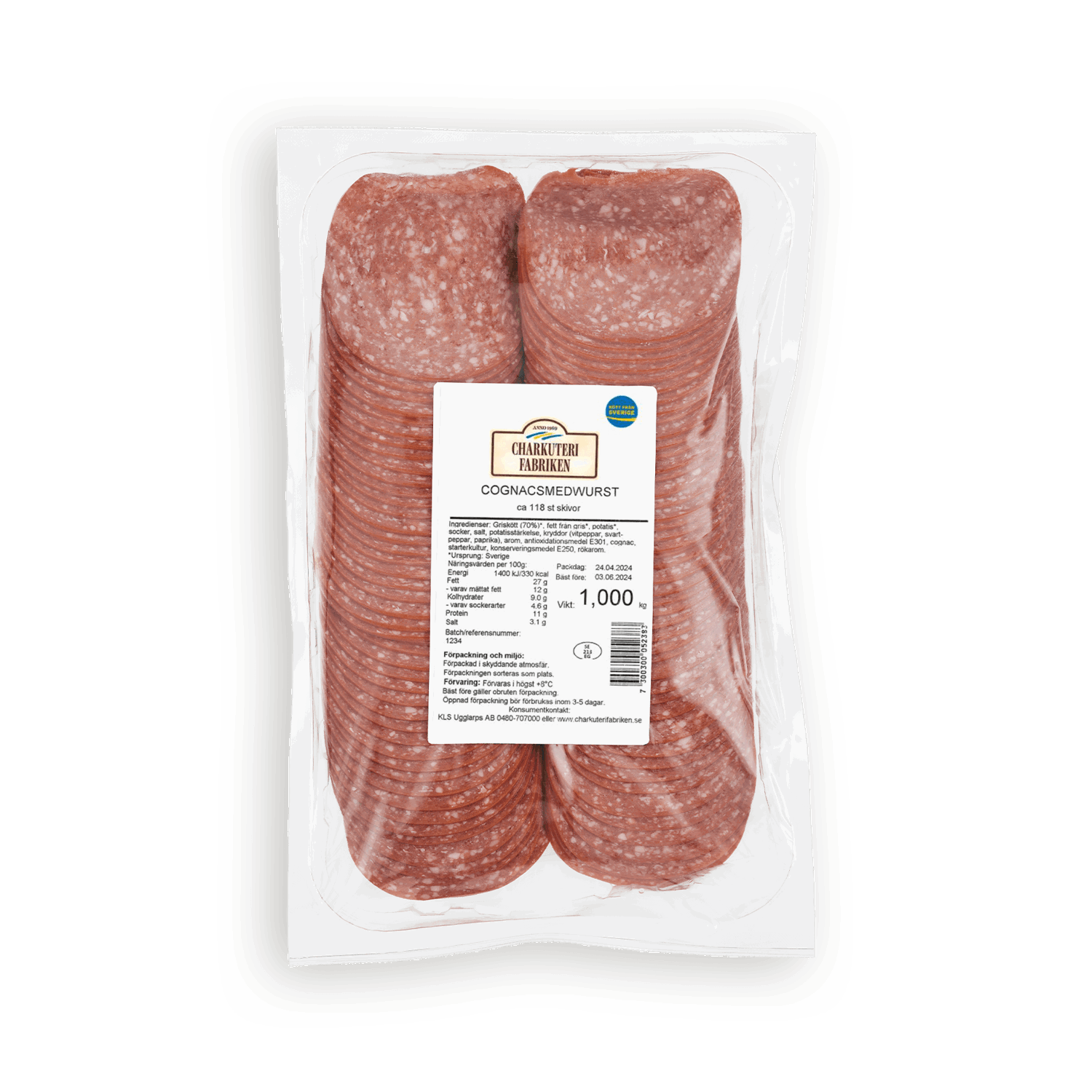 Charkuterifabrikens cognacssmedwurst är en favorit hos både unga och gamla. En välbalanserad smakprofil, med milda inslag av peppar och en tydlig cognacsprofil som passar perfekt ihop med den väl avvägda syrligheten och sältan tillsammans med en underbar röksmak. Tillverkad i Sverige, på svenskt kött från svenska gårdar.