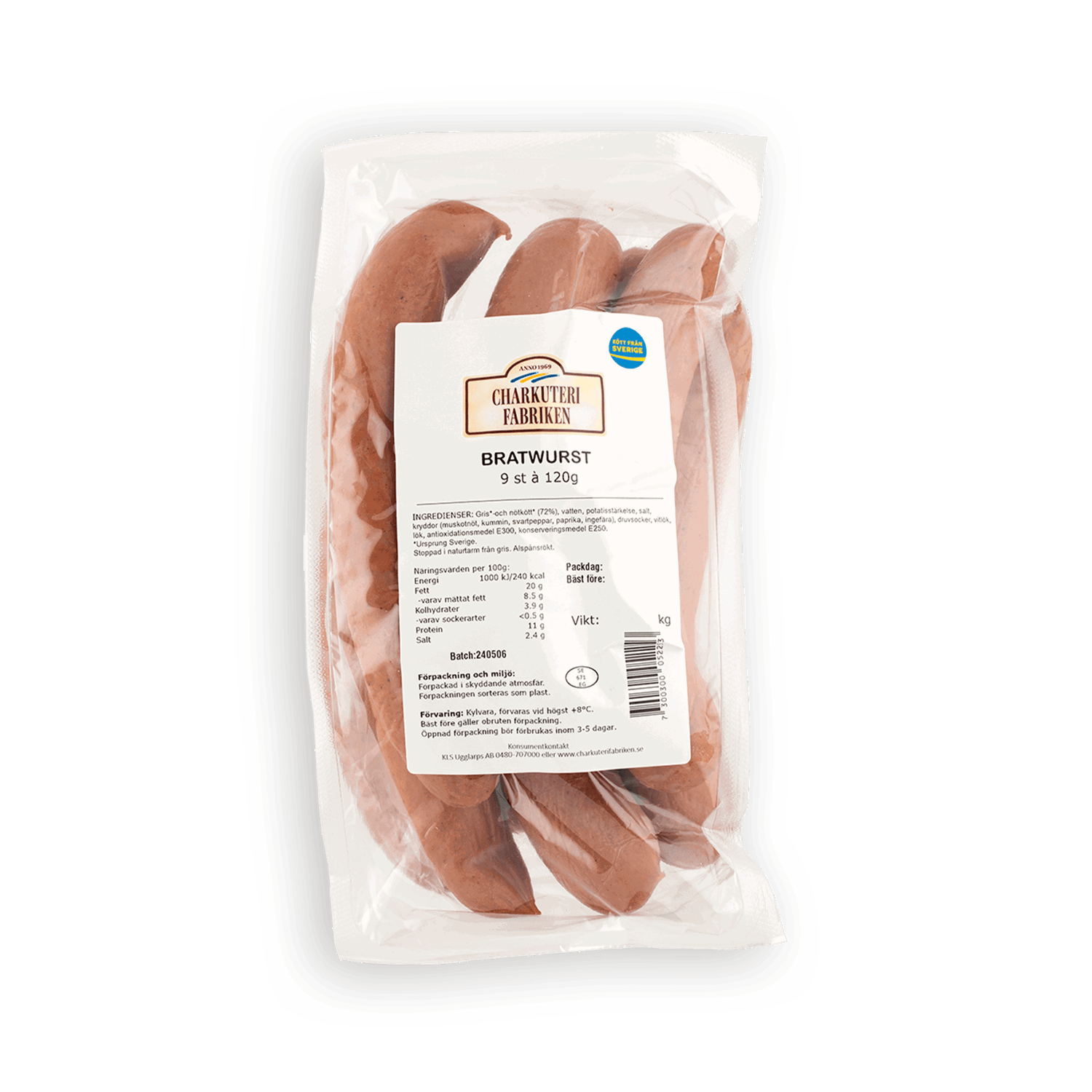 Charkuterifabrikens Bratwurst är härligt kryddad med kummin, muskotnöt och vitlök, med en tydlig röksmak precis som det ska vara. Vår Bratwurst kommer inte göra dig besviken. Gjord på svenskt kött från svenska gårdar.Dabas: https://www.dabas.com/productsheet/07300300052253